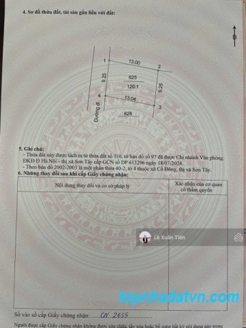 Quý vị đang xem nội dung tin rao "Lô đất 120.1m2 full thổ tại Đồng Trạng, Hòa Lạc mặt tiền 9,25m. Đường thông ôtô tránh. Chỉ 33tr/m2". Mọi thông tin liên quan tới tin rao này là do người đăng tin đăng tải và chịu trách nhiệm. Chúng tôi luôn cố gắng để có chất lượng thông tin tốt nhất, nhưng chúng tôi không đảm bảo và không chịu trách nhiệm về bất kỳ nội dung nào liên quan tới tin rao này. Nếu quý vị phát hiện có sai sót hay vấn đề gì xin hãy thông báo cho chúng tôi.
