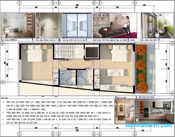 Diện tích xây dựng mỗi tầng: 62m², chiều cao tầng 3,3m.